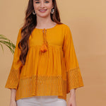 Mustard Solid Tops & Tunic - Rayon Fabric, 3/4 Sleeves, Keyhole Neck And Hips Length