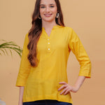 Mustard Solid Tops & Tunic - Linen Fabric, 3/4 Sleeves, Mandarin Collar And Hips Length