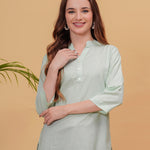 Parrot Green Solid Tops & Tunic - Linen Fabric, 3/4 Sleeves, Mandarin Collar And Hips Length
