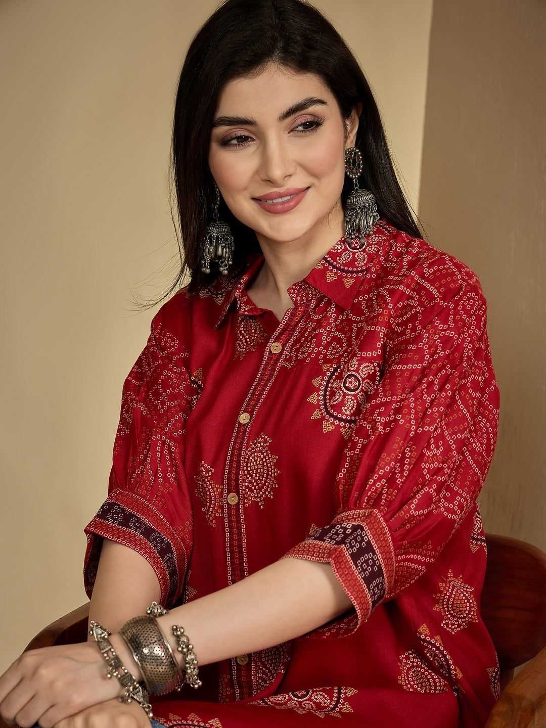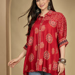 Rayon Hip Length Printed 3/4 Sleeve Shirt Collar Flared Top (Preorder)