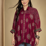 Rayon Hip Length Printed 3/4 Sleeve Shirt Collar Flared Top (Preorder)
