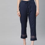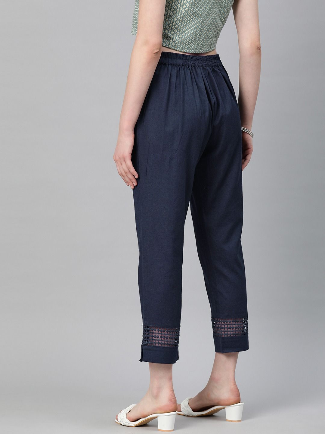 Description - Straight Style Cotton Fabric Navy Blue Color Trouser With Pockets And Lace