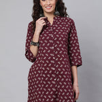 Burgundy Printed Straight Tunic With Three Quarter Sleeves
