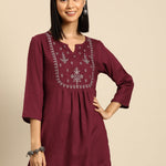 Women Maroon Embroidered Yoke Straight Tunic With Three Quarter Sleeves