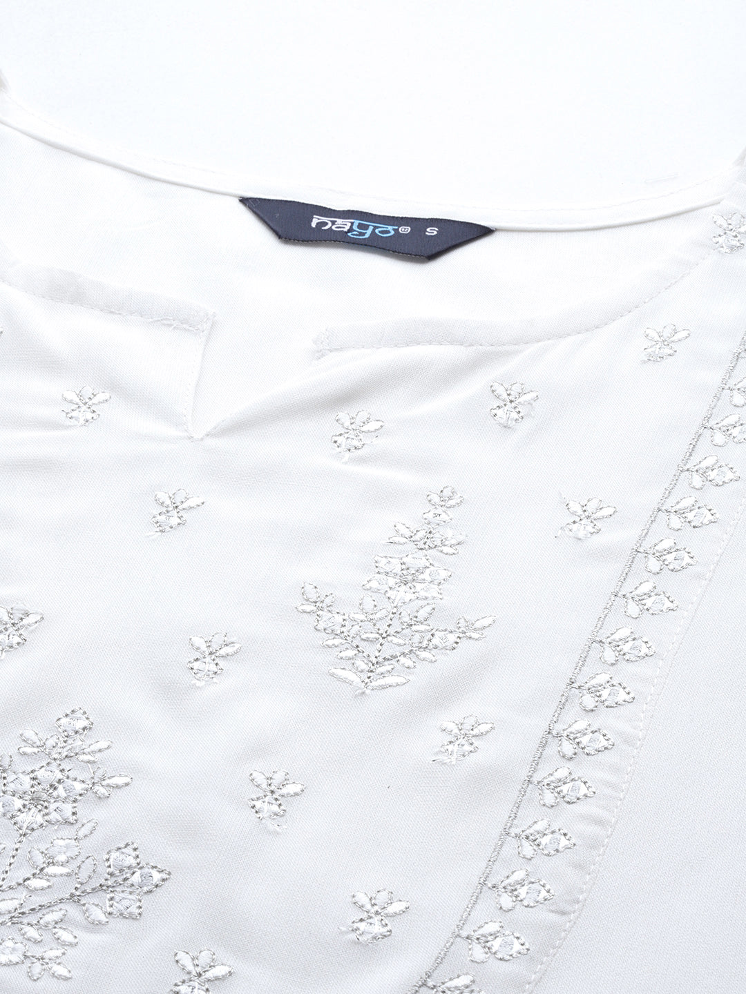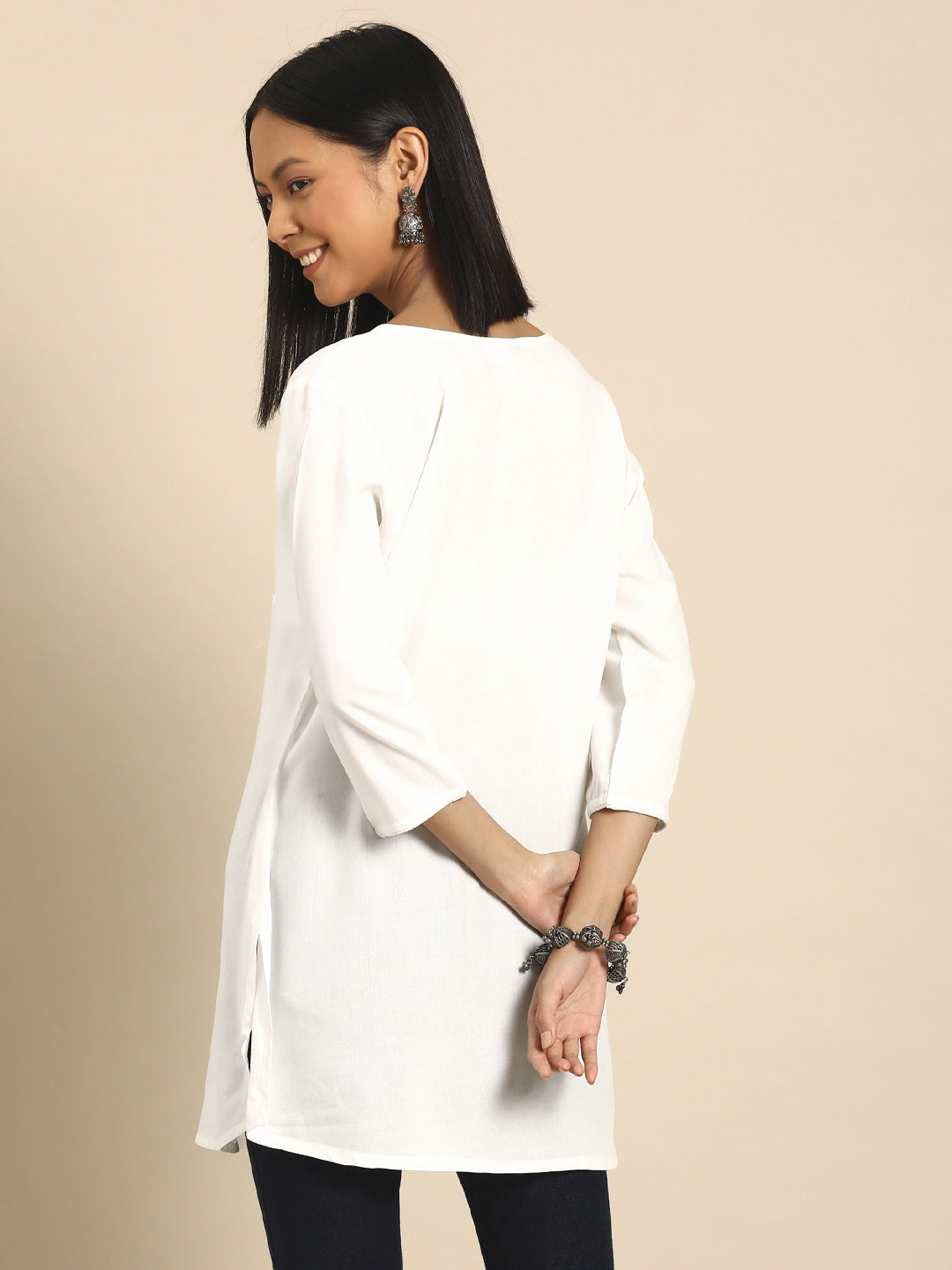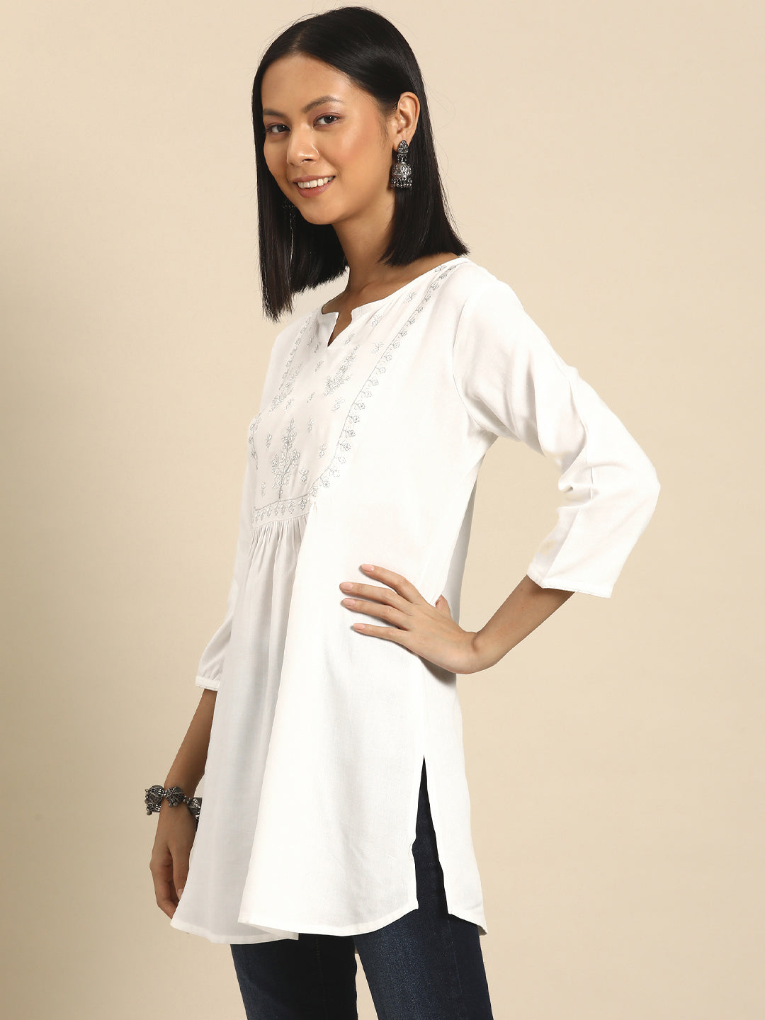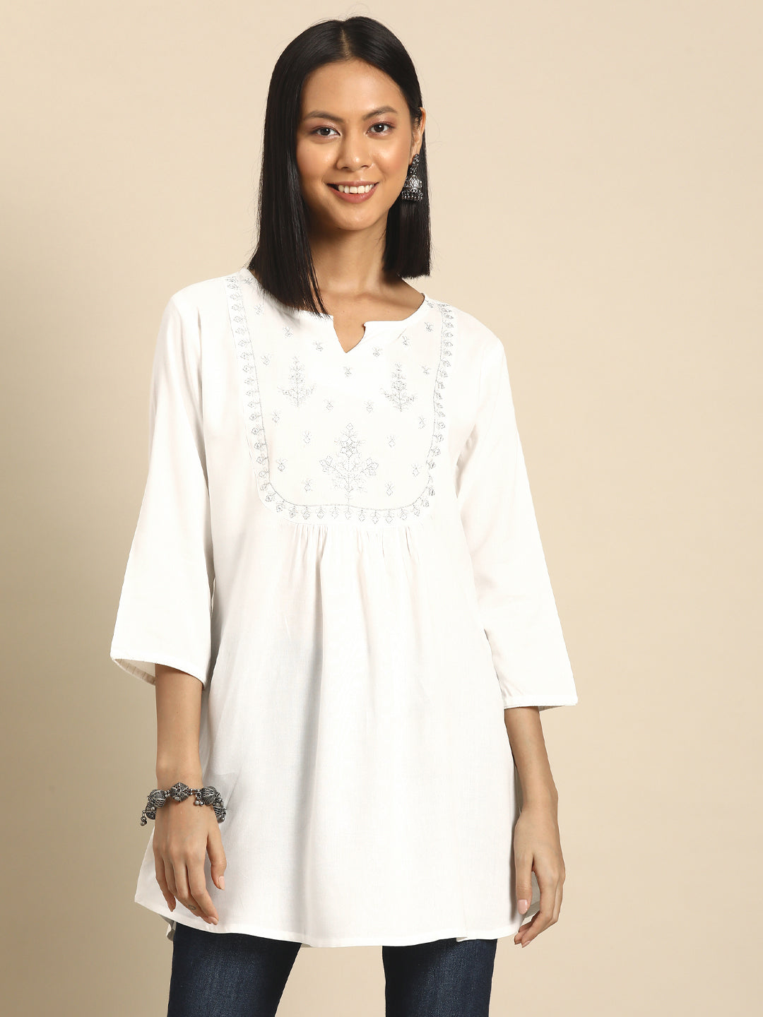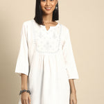 Women White Embroidered Yoke Straight Tunic With Three Quarter Sleeves