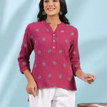 Wine Women Floral Embroidered High-Low Cotton Tunic With Half Placket