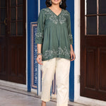 Green Modal Rayon Alia-Cut Embroidered Tunic