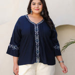 Navy Blue Modal Rayon Floral Embroidered Plus Size Tunic With Pintucks At Front