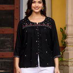 Black Rayon Gathered Embroidered Tunic With Buttons
