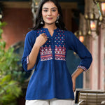 Blue Solid Cotton Short Tunic With Thread & Mirror Work