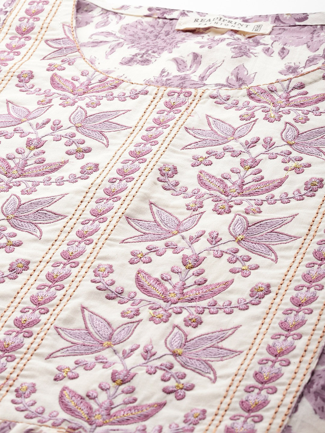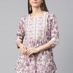 Frock Style Cotton Fabric Purple Color Printed Short Kurti With Thread & Zari Work