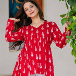 Red Self Design Cotton Fabric Tunics Three-Quarter Sleeves V-Neck Hip Length