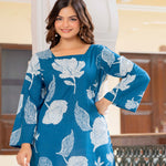 Blue Self Design Cotton Fabric Tunics Three-Quarter Sleeves Square Neck Hip Length