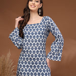 Navy Blue Self Design Cotton Fabric Tunic 3/4 Sleeves Square Neck Hip Length