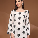 White Self Design Cotton Fabric Tunic 3/4 Sleeves Square Neck Hip Length