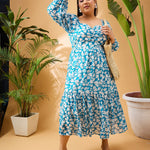 Women Turquoise Tropical Hem Tiered Midi Dress