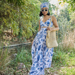 Women White & Blue Floral Front Cut Out Strappy Midi Dress