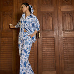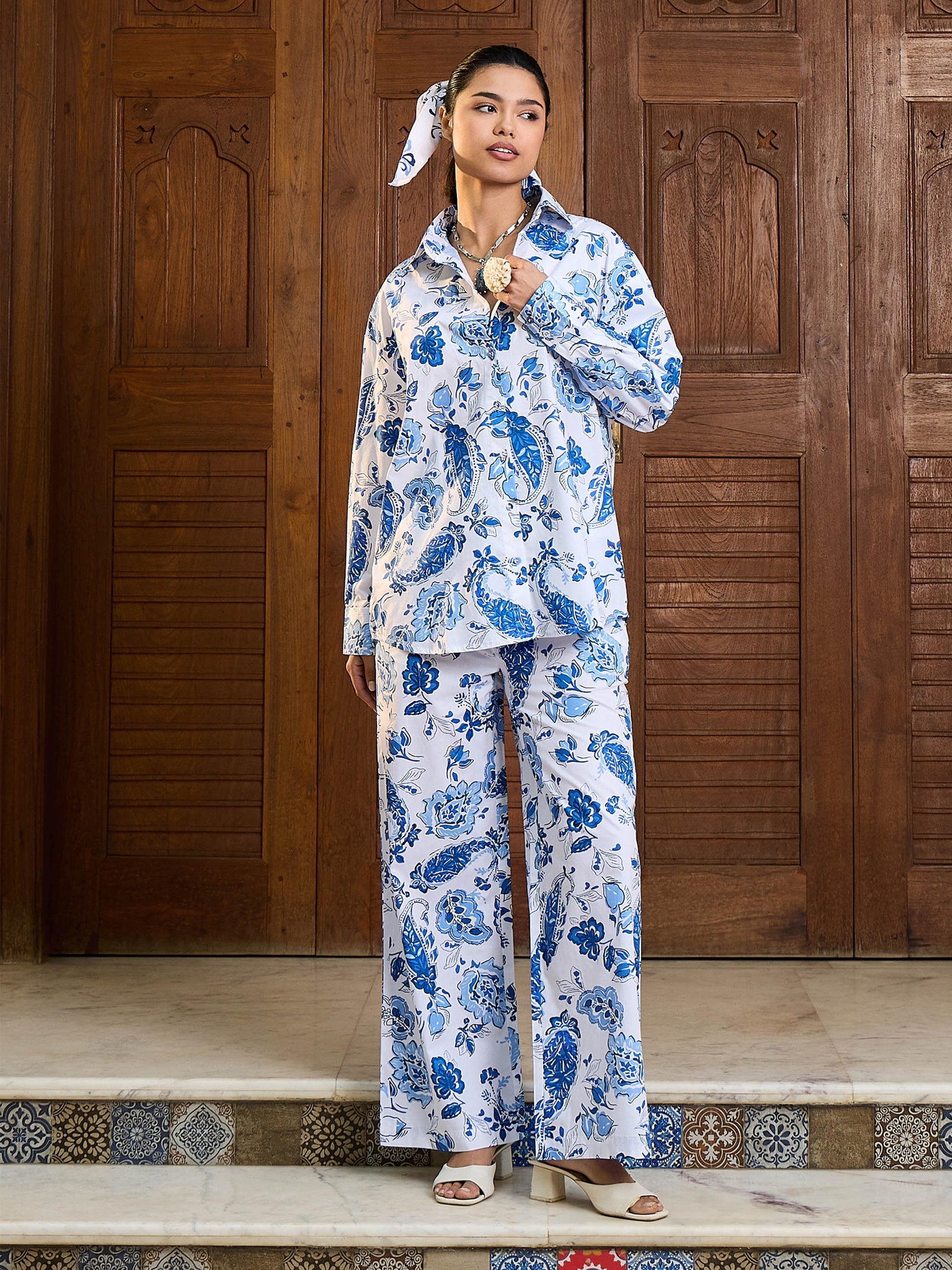 White & Blue Floral Shirt With Pants, in Cotton Poplin fabric, Unlined, Regular Length , Comfort Fit , Button Closure, Straight Hemline and features Self Fabric Button At Front