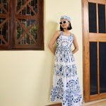 White & Blue Floral Strappy Tired Maxi Dress, in Cotton Cambric fabric, Cotton Voile, Maxi Length, Fit & Flare, No Closure, Flared Hemline and features Lace Detail At Front
