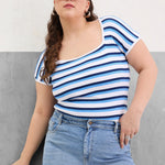 Women White & Blue Rib Stripe Square Neck Top