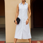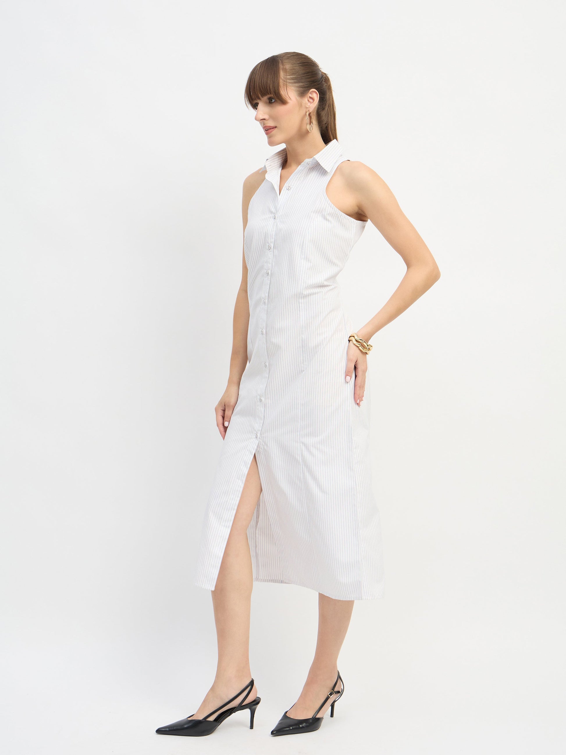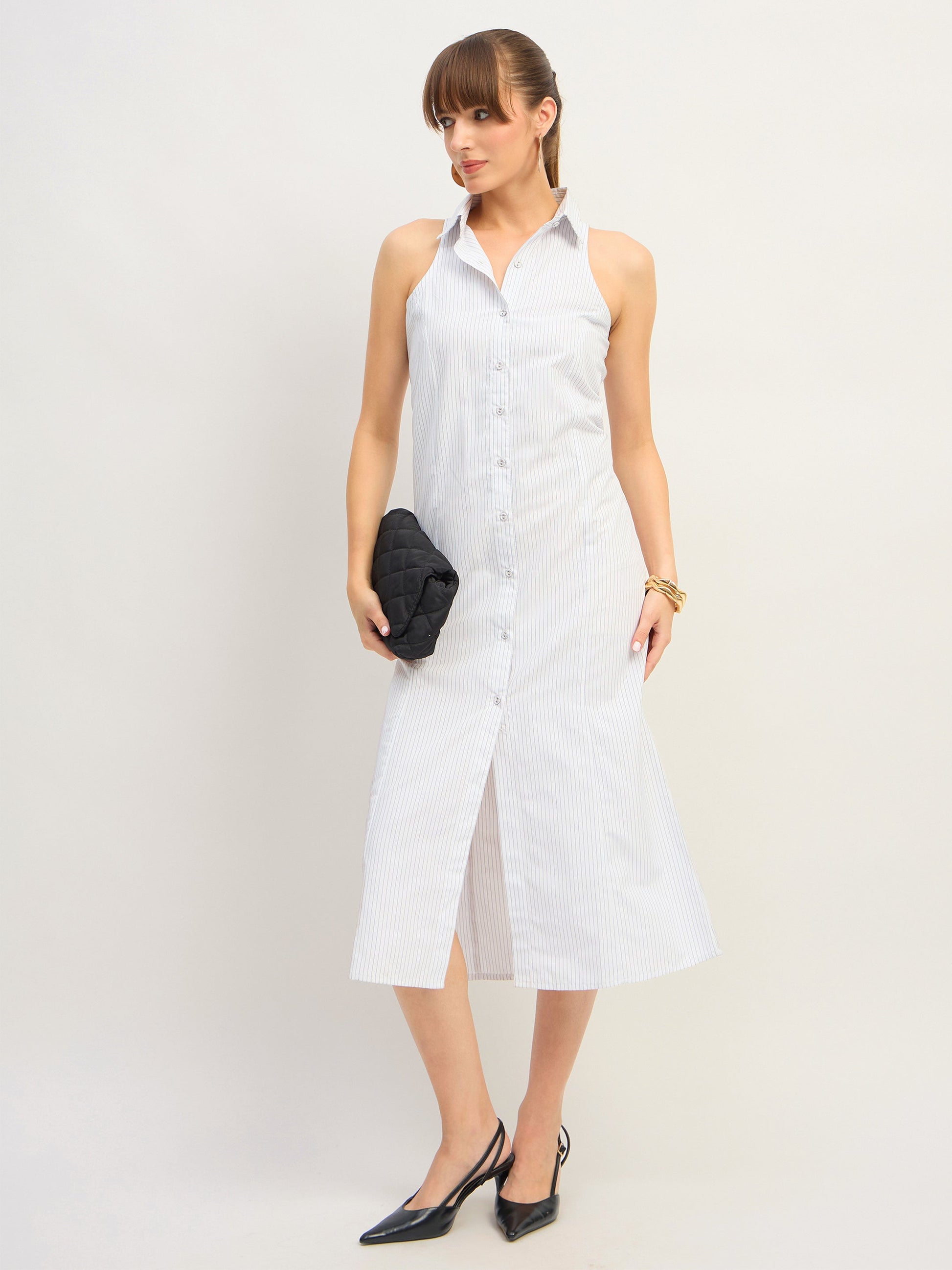 White & Blue Stripes Sleeveless Midi Dress, in Cotton Poplin fabric, Cotton Lining, Midi Length, Comfort Fit, Button Closure, Straight Hemline and features Tie Detail At Back