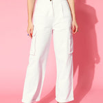 White Box Pockets Straight Pants, in Cotton Twill fabric, Unlined, Full Length, Comfort Fit, Button Closure, Straight Hemline and features Box Pockets On Sides