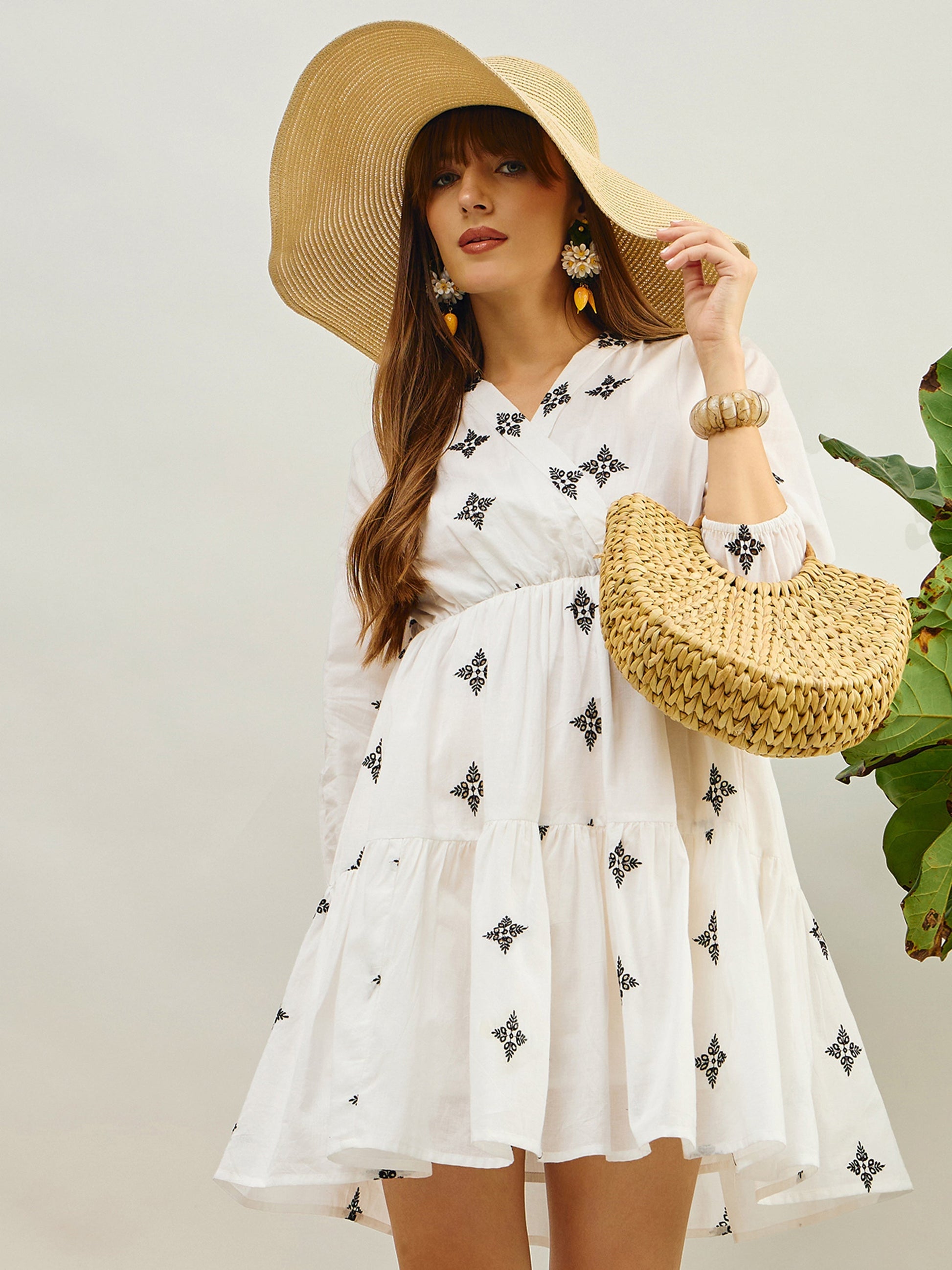 White Embroidered Shawl Collar Tiered Dress, in Cotton Cambric fabric, Unlined, Knee Length, Fit & Flare, No Closure, Flared Hemline and features Wrap Detail At Front