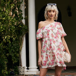 White Floral Chinon One Shoulder Boxy Dress, in Chinon fabric, Unlined, Knee Length , Boxy Fit, No Closure, Flared Hemline and features Beading Lace Insert