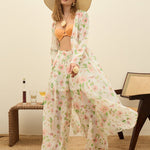 White Floral Long Top With Flared Pants, in Georgette fabric, Polyknit Lining, Below Knee, Comfort Fit, Button Closure, Straight Hemline and features Button Detail At Sleeve / Pleates At Front
