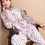 White Floral Sleeve Knot Buttonned Kurti , in Cotton Cambric fabric, Unlined, Regular Length, Comfort Fit , Button Closure, Flared Hemline and features Wooden Button At Front