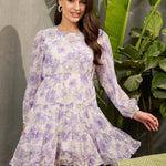 White Floral Tiered Short Dress, in Georgette fabric, Poly Knit Lining, Above Knee, Fit & Flare, Button Closure, Flared Hemline and features Key-Hole Detail At Back
