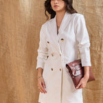 White Full Sleeves Double Breasted Blazer Dress, in Cotton Twill Lycra fabric, Polyknit, Above Knee, Comfort Fit, Button Closure, Straight Hemline and features Golden Button Detail At Front
