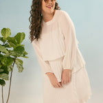 White Pleated Skater Tiered Dress, in Heavy Georgette fabric, Poly Knit Lining, Above Knee, Fit & Flare, Button Closure , Flared Hemline and features Keyhole Detail At Back
