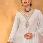 Women White Rayon Embroidered Kurta With Pencil Pants & Dupatta