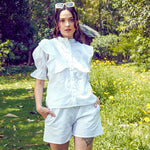 White Schiffli Puff Sleeves Shirt With Paperwaist Shorts, in Cotton Schiffli fabric, Unlined/ Voile, Regular Length, Regular Fit, Button Closure, Straight Hemline and features Ruffle Detail At Front