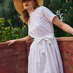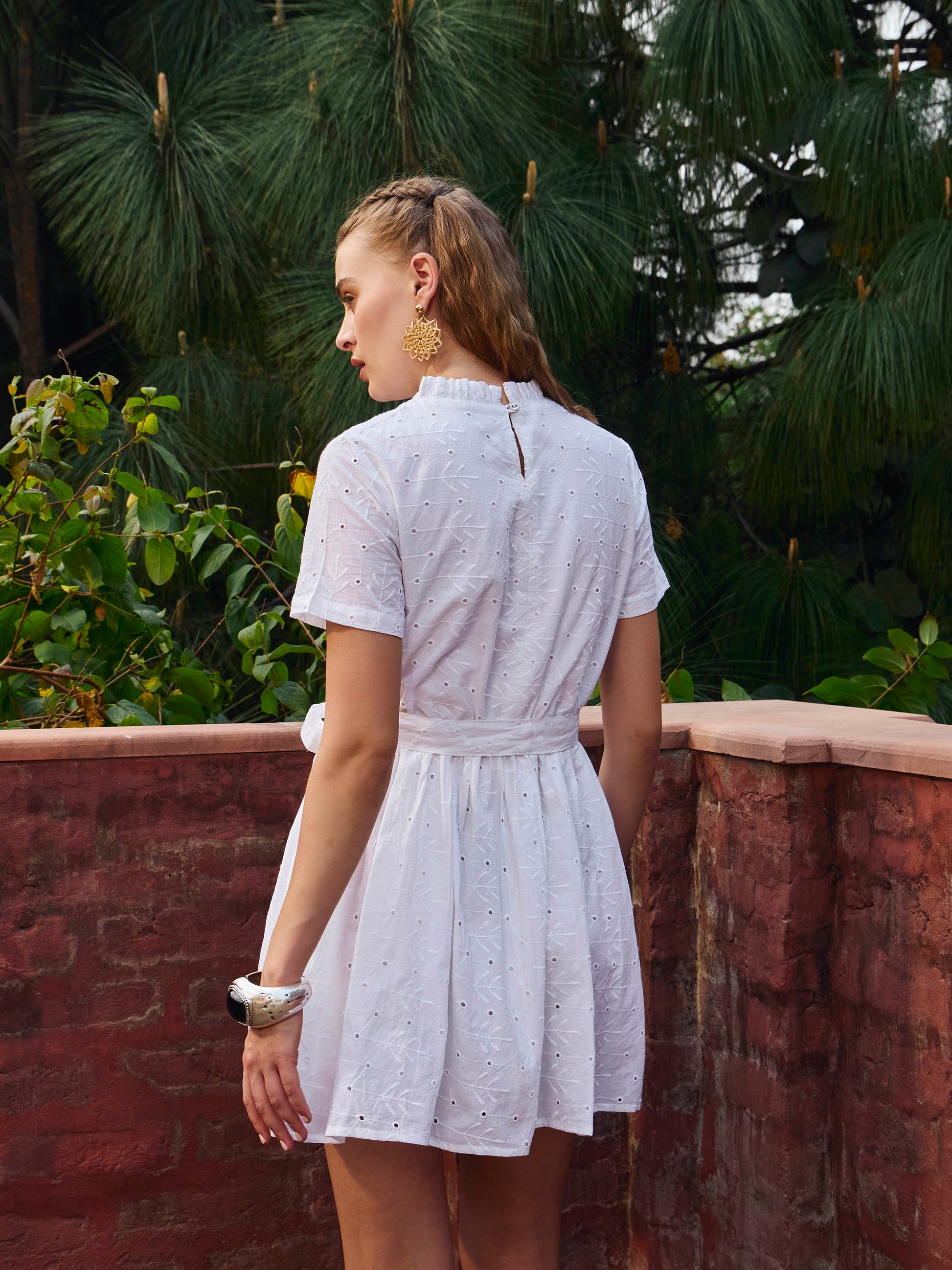 White Schiffli Round Neck Belted Short Dress, in Cotton Schiffli fabric, Cotton Lining, Above Knee, Fit & Flare, Button Closure, Flared Hemline and features Key Hole Detail At Back