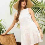 White Schiffli Sleeveless Gathered Short Dress, in Schiffli fabric, Cotton Voile Lining, Above Knee, Regular Fit, Button Closure, Flared Hemline and features Princess Seams Detail At Front