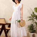 Women White Schiffli Square Neck Frill Hem Maxi Dress