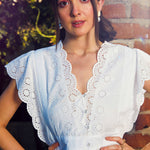 White Schiffli V-Neck Top, in Cotton Schiffli fabric, Cotton Voile, Regular Length, Regular Fit, Button Closure, Straight Hemline and features Scallop Detail