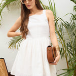 White Square Neck Strappy Short Dress, in Schiffli fabric, Cotton Voile Lining, Above Knee, Fit & Flare, NA, Flared Hemline and features Gathers Detail At Waist