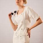 White Tweed Round Neck Short Dress, in Tweed fabric, Unlined, Above Knee, Slim Fit, Zipper Closure, Straight Hemline and features Golden Button Deatil At Front