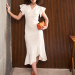 White V-Neck Scuba Frill Midi Dress, in Scuba fabric, Unlined, Midi Length, Comfort Fit, No Closure, Flared Hemline and features Frill Sleeve and Pleats Detail