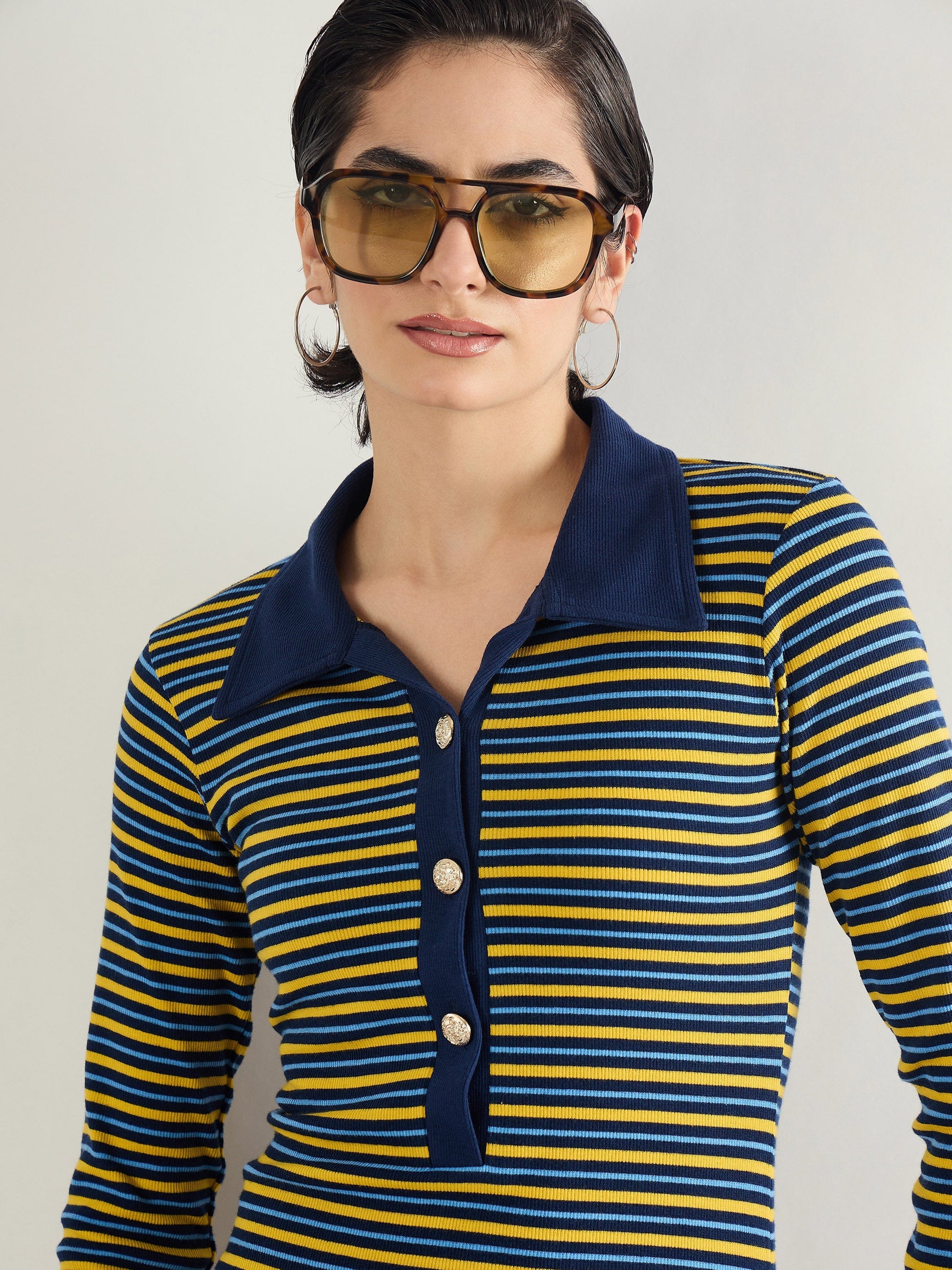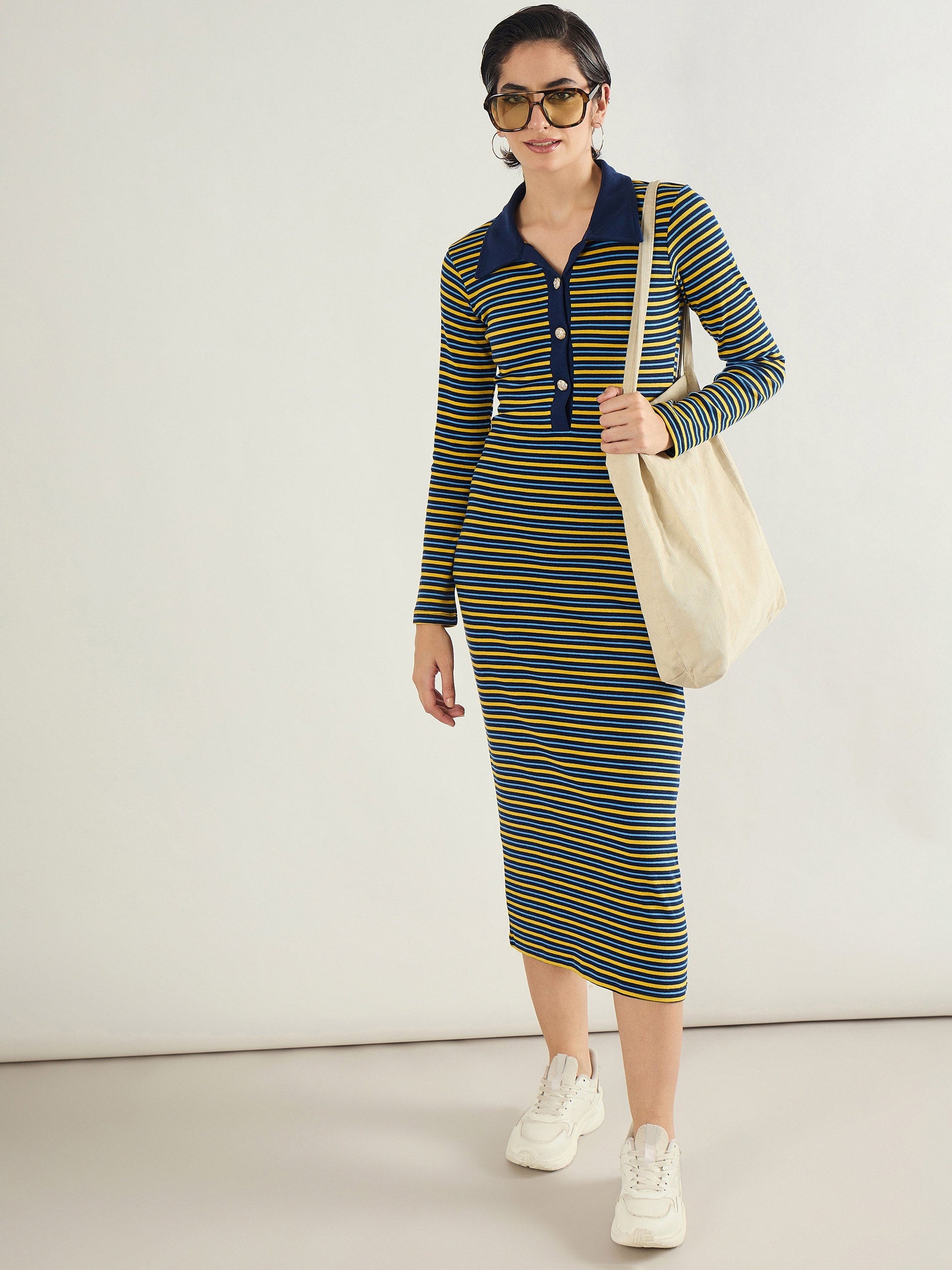 Yellow & Blue Stripe Full Sleeve Midi Dress, in 2X2 Rib fabric, Unlined, Midi Length, Slim Fit, Button Closure, Straight Hemline and features Golden Button At Front