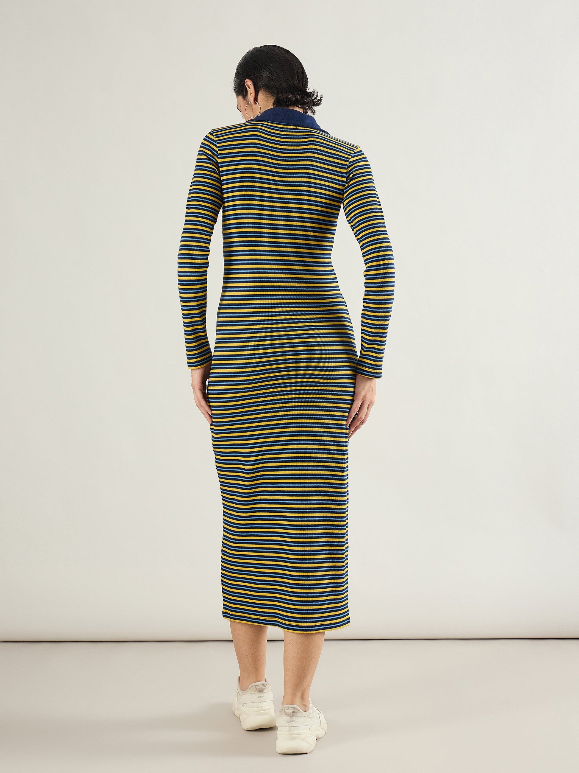 Women Yellow & Blue Stripe Full Sleeve Midi Dress