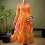 Yellow Floral Anarkali Kurta, in Georgette fabric, Butter Crepe Lining, Maxi Length, Fit & Flare, Zipper Closure, Flared Hemline and features Dori Detail At Back