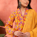 Women Yellow Floral Cambric V Neck Kurta With Pencil Pants & Dupatta