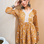 Yellow Floral Cambric V Neck Peplum Kurti , in Cotton Cambric fabric, Unlined, Regular Length , Fit & Flare , No Closure , Flared Hemline and features Lace Detail At Neck