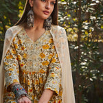 Women Yellow Floral Gathered Kurta With Pencil Pants & Dupatta