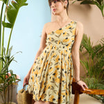 Women Yellow Floral Organza One Shoulder Dress