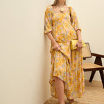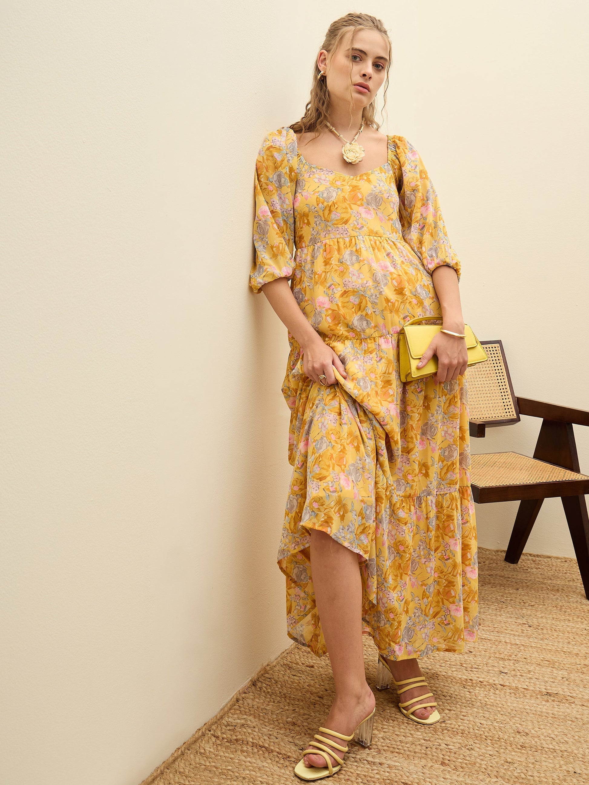 Women Yellow Floral Sweetheart Neck Maxi Dress